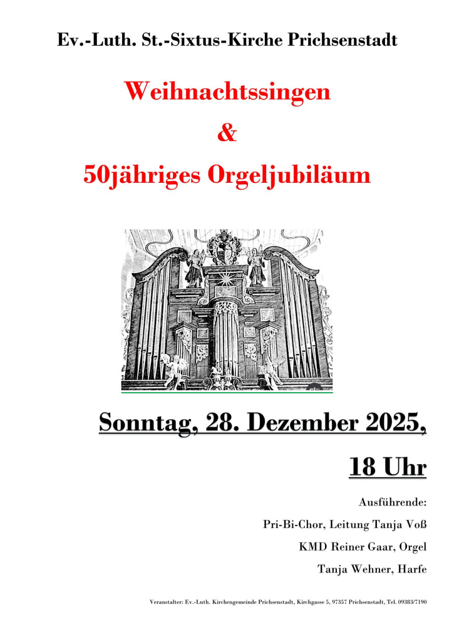 Am Sonntag, 28. Dezember 2025 lädt die Ev. Kirchengemeinde Prichsenstadt-Bimbach um 18 Uhr zu einem feierlichen Weihnachtssingen in die St.-Sixtus-Stadtkirche in Prichsenstadt ein.